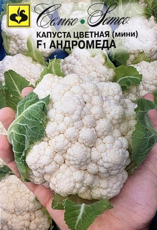 Цветная (мини) капуста Андромеда F1 - ранний гибрид порционной цветной капусты. От высадки 30-дневной рассады до уборки 45-50 дней. Розетка листьев вертикальная, листья крупные, тёмно-зелёные. Головка округлая, слегка прикрытая, плотная, ярко-белого цвета, массой 400-500 г. Отличается высокой энергией роста, дружным завязыванием и созреванием головок в неблагоприятных условиях выращивания. Вкусовые качества и товарность отличные. Гибрид требователен к плодородию почвы и повышенному содержанию азота в почве, обязательны внекорневые подкормки бором и молибденом. Используется для получения мини головок цветной капусты и порционного их использования как в свежем виде, так и всех видах переработки. Плотность посадки 4-5 растений/м2. Урожайность 1,6-2,5 кг/м2.