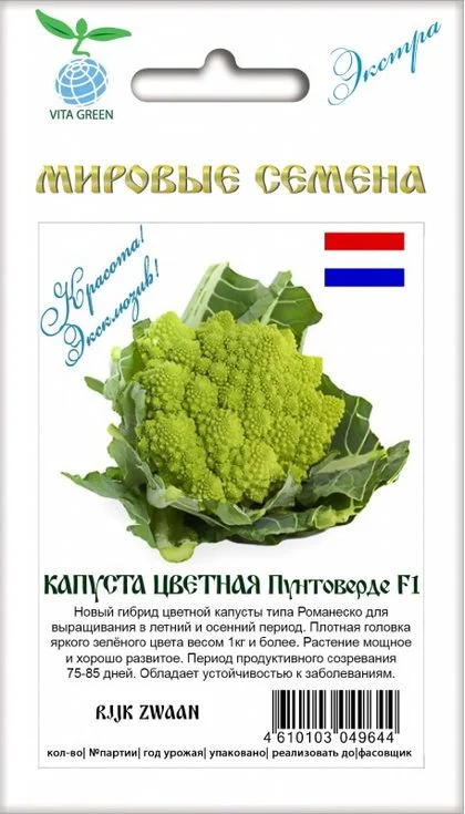 Новый гибрид цветной капусты типа Романеско для выращивания в летний и осенний период. Плотная головка яркого зелёного цвета весом 1кг и более.Растение мощное и хорошо развитое. Период продуктивного созревания 75-85 дней.Обладает устойчивостью к заболеваниям.