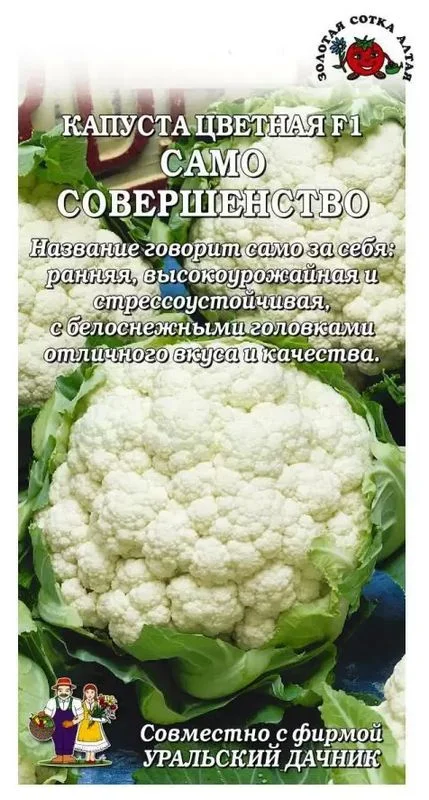 Раннеспелый, высокоурожайный, стрессоустойчивый гибрид, легко адаптирующийся к погодным катаклизмам. Головка округло-плоская, полностью покрыта листьями, плотная, белоснежная, массой до 1,5 кг. Вкусовые качества отличные. Гибрид устойчив к болезням, рекомендуется для употребления в свежем виде и переработки.Цветная капуста очень требовательна к питанию и влаге, не выносит кислых почв. Посев на рассаду проводят середине марта. Через 7-10 дней после появления всходов сеянцы пикируют. Рассада готова к посадке через 35-40 дней после всходов. Сажают ее в конце апреля, по схеме 35x50 см. Дальнейший уход заключается в поливе, прополке, рыхлении и регулярной подкормке. Обязательно притенение головок: 2 листа надламывают или связывают над головкой (чтобы она сохранила белый цвет и не распадалась). В южных регионах можно высевать семена капусты непосредственно в грунт.