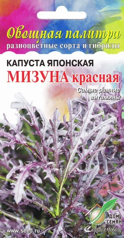 Скороспелая японская листовая капуста, не образующая кочана.. Готова к употреблению уже через 40-45 дней после появления всходов. Культура невероятно красива и полезна, за что ценится у себя на родине в Японии. Богата биологически активными веществами и витаминами, содержит много каротина, витаминов С, В1, В2, РР, соли калия, кальция, фосфора, железа. Показана после весенних авитаминозов, для профилактики сердечно-сосудистых, онкологических заболеваний,  язвы желудка. Мизуна красная имеет антоциановый оттенок листвы и наиболее полезна для организма.Растение  высотой  до 40-50 см, формирует пышную розетку ажурных  листьев бордового цвета. Благодаря необыкновенно декоративному виду  часто используется в ландшафтном дизайне, для оформления клумб и украшения бордюров.  Листья Мизуны  опушенные, но  нежные, с легким горчично - редисочным привкусом, напоминают рукколу, но менее резкие по вкусу, без горечи. Культура не требует большого ухода, ее называют « капустой для ленивых», подходит для выращивания летом в открытом грунте.