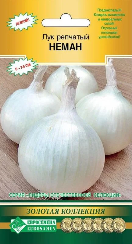 Неман-позднеспелый (120-125 дней от всходов до уборки) сорт длинного дня. Луковицы диаметром 7-8 см, белой окраски, без позеленения, округлые.