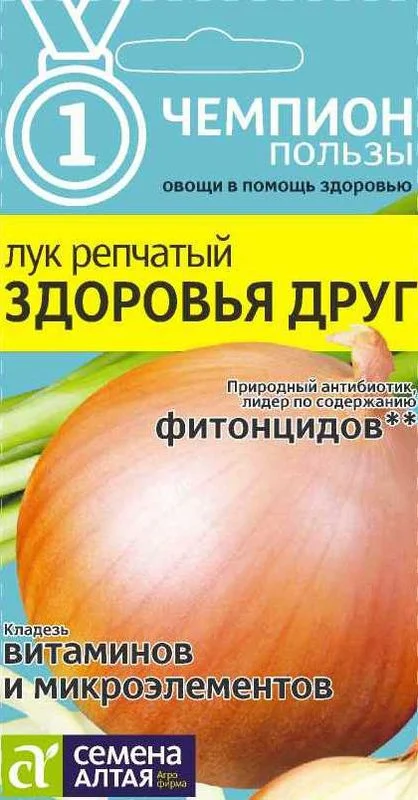 Среднепоздний (120-130 дней) салатный сорт. Рекомендуется для выращивания в однолетней культуре. Луковица крупная, овальная, сухие чешуи соломенно-желтые, сочные - белые, средняя масса 200-500 г, отдельные луковицы достигают 800 г.Вкус гармоничный, сладко-острый, очень нежный. Лук репчатый по праву считается кладезью витаминов для защиты организма от болезней. Сок репчатого лука является природным антибиотиком. Из овощных культур лук является лидером по содержанию фитонцидов! Лук «Здоровья друг» содержит целый комплекс витаминов и микроэлементов: витамины группы B, C, E, H, PP и другие, калий, необходимый для деятельности нервной и сердечно-сосудистой систем, кремний, помогающий усвоению кальция, кальций и фосфор, необходимые для укрепления и восстановления костных тканей, железо, участвующее в насыщении тканей организма кислородом, йод, марганец, участвующий в обменных процессах и препятствующий деятельности свободных радикалов, цинк и медь, также необходимые для обменных процессов. Перо лука богато каротином. Кроме того, лук – ценный источник энергии, мякоть содержит 40 кКал,что делает его одним из лидеров среди овощей.