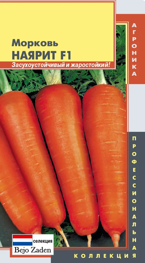 Новый среднеранний гибрид сортотипа Берликум/Нантская. Период от всходов до уборки урожая составляет 101 день. По качественным характеристикам схо-ден с великолепно зарекомендовавшим себя во всех земледельческих регионах гибридом Нандрин F1. Образует корнеплоды красивой формы и окраски, массой 150-250 г. Отлично переносит засуху и высокие температуры, сохраняя при этом стабильно высокий урожай. Хорошая лежкость, не теряет товарные качества и питательные свойства при длительном хранении.
