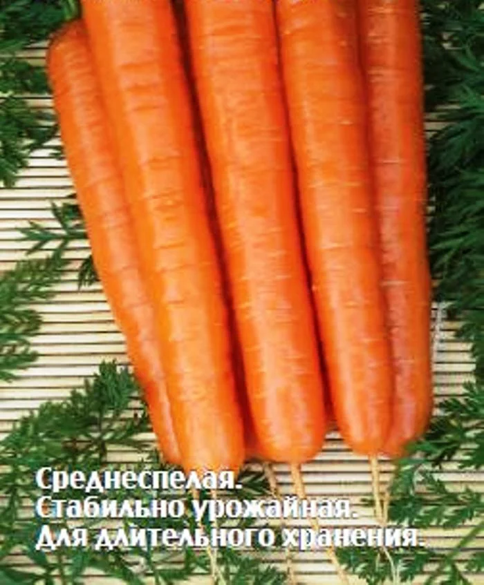 Среднеспелый (от всходов до технической спелости корнеплодов 88-108 дней) сорт, улучшенный по выравненности и товарным качествам корнеплодов благодаря отбору. Корнеплоды цилиндрические, тупоконечные, ярко-оранжевые, длиной 15-17 см, массой 90-160 г, сочные и очень сладкие. Ценность сорта: стабильная урожайность, пригодность для длительного хранения, товарность корнеплодов. Рекомендуется для употребления в свежем виде, переработки, замораживания.