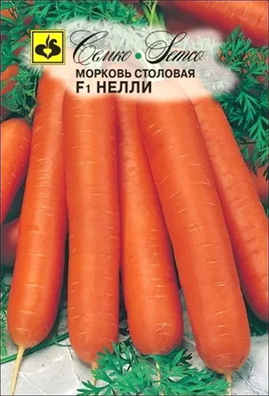 Морковь Нелли F1 - ранний гибрид моркови сортотипа Нантская. От всходов до созревания 80–90 дней. Розетка листьев от прямостоячей до полураскидистой. Лист зеленый, среднерассеченный. Корнеплоды цилиндрические с тупым кончиком, гладкие, выровненные, длиной от 18 до 25 см, диаметром 3 см, массой 80–110 граммов, красивого оранжевого цвета. Головка маленькая, корнеплод слабо выступает над поверхностью почвы. Вкусовые качества отличные, товарность высокая, не растрескивается, транспортабельность хорошая. Содержание сухого вещества 11,5–14,6%, сахара общего 5,8–7,4%, β-каротина до 16,8 мг%. Гибрид устойчив к цветушности. Требователен к плодородию почвы, выращивают на высоких грядах. Рекомендуется для потребления в свежем виде, производства ранней пучковой продукции и упаковки в полиэтиленовые пакеты, консервирования и замораживания. Густота посева 0,8–1,1 млн семян/га, схема посева 45х5 см. Урожайность 6–8 кг/м2.