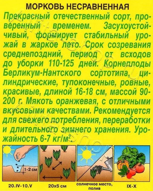 Сорт среднеспелый (период от всходов до технической спелости 90-115 дней).Корнеплоды цилиндрические, тупоконечные, ровные, красивые. Мякоть ярко-оранжевого цвета, сочная, нежная, сладкая, сердцевина плотно соединена с мякотью. Масса корнеплода 90-200 г.Сорт отличается превосходной лежкостью корнеплодов. Рекомендуется использовать для потребления в свежем виде, переработки и для хранения. Сорт устойчив к цветушности.Посев в самые ранние сроки, в конце апреля – начале мая, возможен подзимний посев, на глубину 2-2,5 см, с шагом между строчками 20 см. Посевы до всходов желательно укрыть плёнкой. При появлении всходов проводят 1-ое прореживание, оставляя между растениями 1-1,5 см, через 2 недели – 2-ое, увеличивая расстояние до 4 см.
