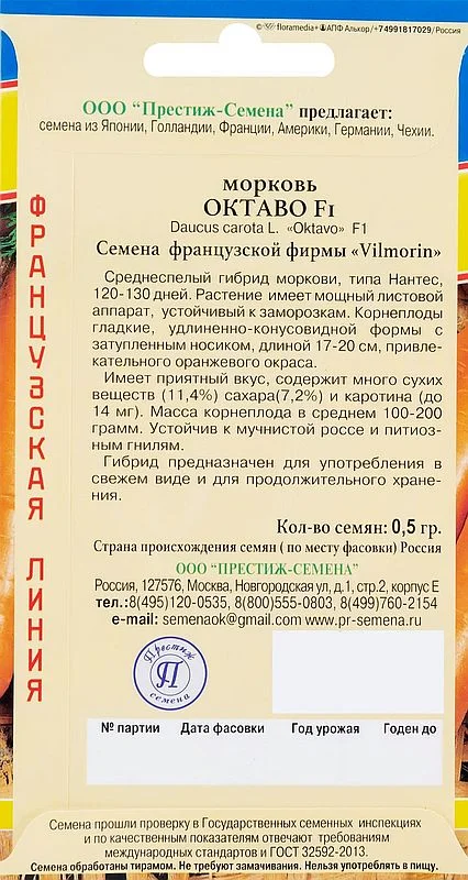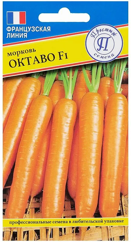 Морковь Октаво F1-среднеспелый гибридный сорт со сроком вызревания корнеплодов 4 месяца и высоким содержанием каротина (до 14 мг/100 граммов). Подходит для выращивания в открытом грунте и под пленочными укрытиями. Средний вес корнеплода-150 граммов, длина-17−18 см, диаметр — 5−6 см. Форма удлиненно-коническая, выровненная. Окраска ярко-оранжевая. Текстура плотная, не склонная к растрескиванию.Сахаристость — 7%. Планируемая урожайность при выращивании в открытом грунте — 5−6 кг/м², в теплице-до 8 кг.