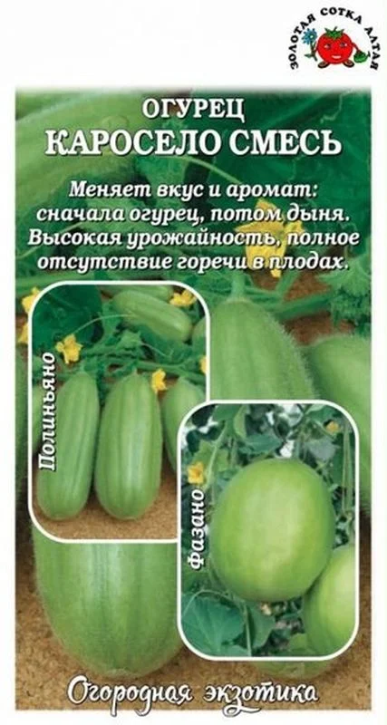 Итальянский огурец или серебристая дыня – это экзотическая бахчевая культура семейства тыквенных, обладающая способностью и зависимости от стадии зрелости менять вкус и аромат. Смесь включает сорта Полиньяно и Фазано. Созревание наступает через 70-75 дней после всходов. Огурдыня ценится за полное отсутствие горечи в плодах, высокую урожайность и плодоношение до заморозков.