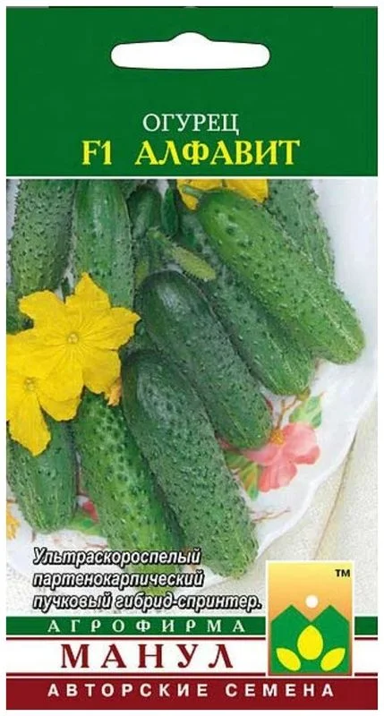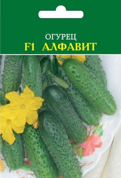Огурец F1 Алфавит - урожайный партенокарпический пучковый гибрид-спринтер корнишонного типа для весенних теплиц, тоннелей, открытого грунта. Растения женского типа цветения, характеризуются высокой скороспелостью, очень слабым ветвлением. В узлах формируется от 2-3 до 4-5 завязей. Зеленцы бугорчатые, белошипые, с частым опушением, длиной 8-13 см. Засолочные, консервные и вкусовые качества высокие. Бóльшую часть урожая гибрид отдает за 1-й месяц плодоношения. В последующем начинается вторая волна плодоношения на детерминантных боковых побегах — «букетных веточках». Устойчив к мучнистой росе, оливковой пятнистости, вирусу обыкновенной огуречной мозаики, толерантен к ложной мучнистой росе.