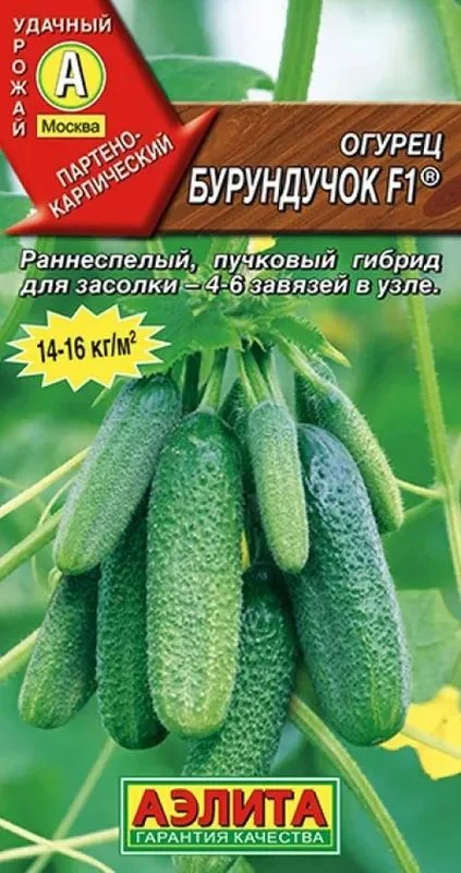 Великолепный партенокарпический гибрид с пучковым заложением завязей. Первый урожай собирают на 40-44 день после всходов. Плодоношение обильное и длительное. В каждом узле формируется от 4 до 6 завязей. Зеленцы массой 80-95 г, короткие, сочные, хрустящие, не перерастают и не горчат. Отлично подходят для засолки, сохраняя упругость и плотность. Гибрид устойчив к кладоспориозу, ВОМ, МР и ЛМР. Урожайность под пленкой до 16 кг/м2.
