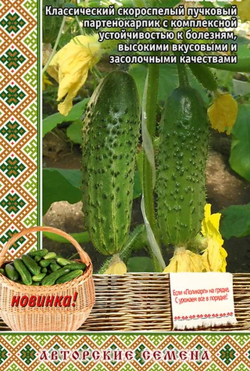 Классический скороспелый пучковый партенокарпик с комплексной устойчивостью к болезням, высокими вкусовыми и засолочными качествами. Ветвление ослаблено, что упрощает уход за растениями. Стартовая партенокарпия высокая. В узлах формируется от 1-3 до 5-6 завязей – в зависимости от условий выращивания. Зеленцы красивые, бугорчатые, длиной 9-12 см, хрустящие, ароматные. Вкусовые и засолочные качества высокие. Большую (основную часть урожая) растения отдают за первый месяц плодоношения (гибрид-спринтер).Плотность посадки в теплицах 2,5 раст./м2, в открытом грунте 3-4,5 раст./м2.