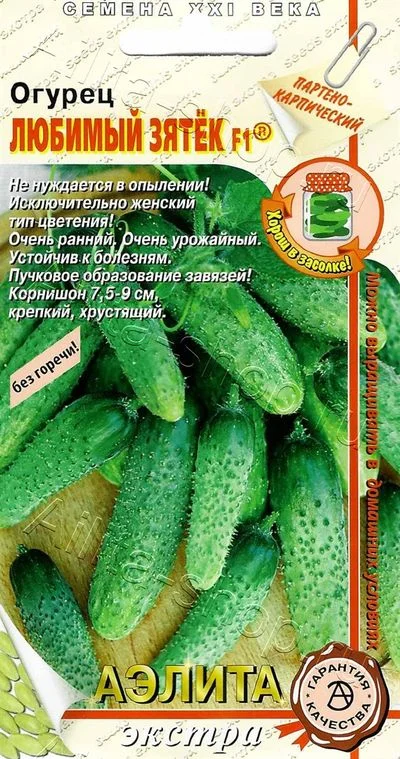 Новый очень ранний самоопыляемый партенокарпический гибрид. Для открытого грунта, пленочных укрытий и стеклянных теплиц. Отличается очень высокой урожайностью, длительным периодом плодоношения и товарностью плодов. Очень устойчив к основным болезням огурца: вирусу огуречной мозаики, настоящей мучнистой росе, оливковой пятнистости, высоко толерантен к ложной мучнистой росе. Плети растения средних размеров. Зеленцы крупнобугорчатые, насыщенно-зеленые, овально- цилиндрической формы. Масса зеленца – 80-95г, длина 7,5-9 см, соотношение длины к диаметру – 3,3:1. Вкусовые качества превосходные, горечи не содержит. Рекомендован для употребления в свежем виде, консервирования и засолки. Компания «АЭЛИТА» является эксклюзивным продавцом семян гибрида огурца «ЛЮБИМЫЙ ЗЯТЁК F1»® на рынке семян.
