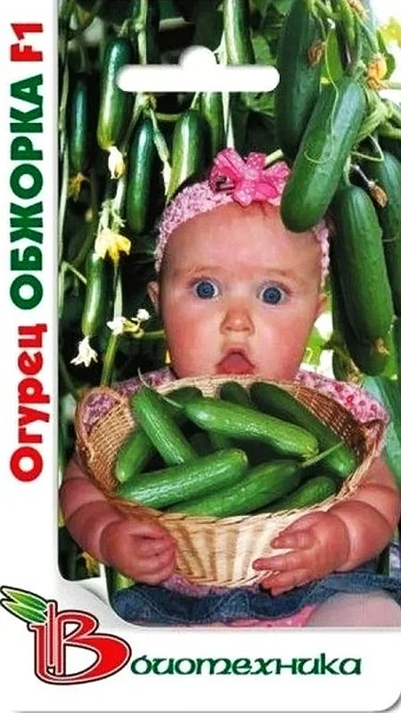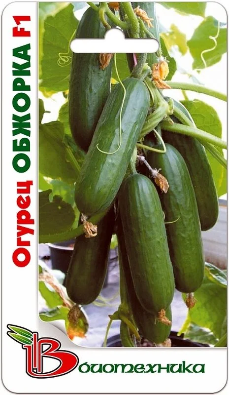 Невероятно урожайный, многоплодный партенокарпический гибрид. Плоды маленькие, гладкие, плотные, хрустящие.Очень вкусные плоды для свежего потребления. Плоды долгое время не желтеют после сбора – 3,5-4 недели.Гибрид Обжорка F1- раннеспелый, 100% партенокарпический. Завязь букетная – в пазухе 4-5 завязей. Зеленец длиной 10-12 см, цилиндрической формы, гладкий, блестящий, темно-зеленый. Консистенция мякоти нежная, хрустящая.Для регионов с прохладным климатом необходим рассадный способ выращивания.Семена высеивают вторфяные горшочки диаметром 10 см со специально подготовленной почвой (2 части перегноя, 1 часть дерновой земли, 1 часть песка) на глубину 1,5 см. Температура воздуха и почвы должна быть 20-23°С. Грунт должен быть равномерно увлажнен (не допускается перелив и закисание почвы). После появления всходов, в процесе роста растений, не допускать снижение температуры ниже 14°С. Сделать 1-2 подкормки полным минеральным удобрением с преобладанием азота. Рассада высаживается когда минует угроза заморозков.