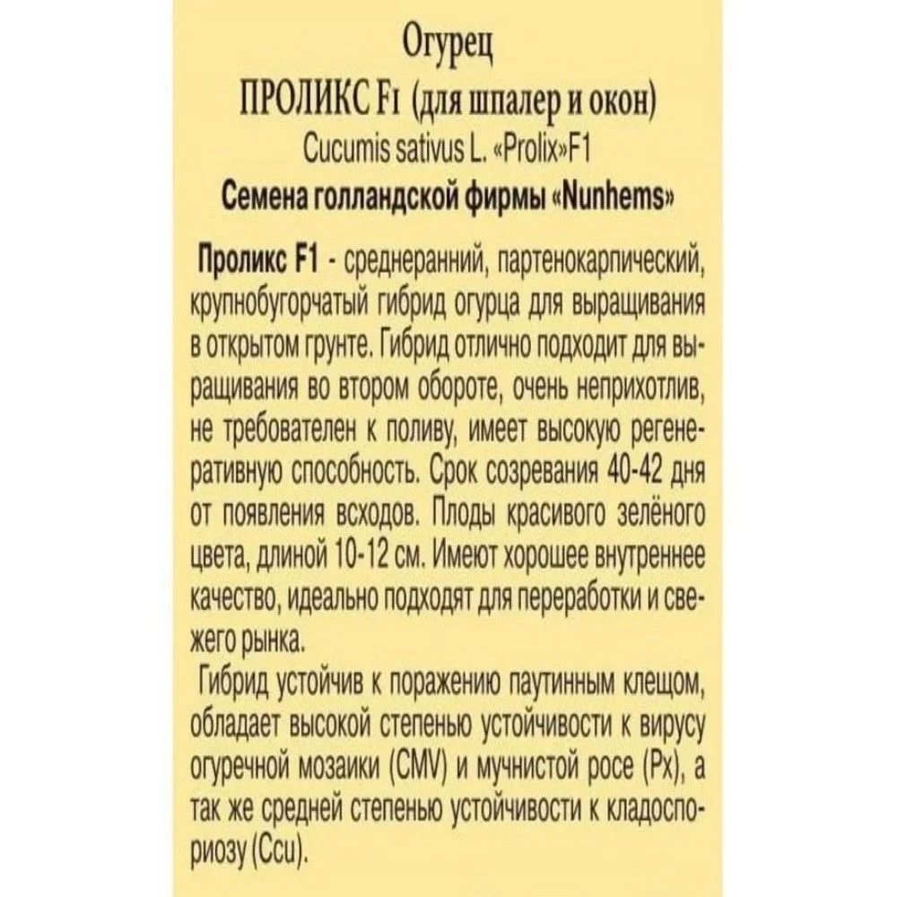 Проликс F1- крупнобугорчатый гибрид огурца для выращивания в открытом грунте. Гибрид отлично подходит для вы ращивания во втором обороте, очень неприхотлив, не требователен к поливу, имеет высокую регенеративную способность.Срок созревания 40-42 дня от появления всходов. Плоды красивого зелёного цвета, длиной 10-12 см. Имеют хорошее внутреннее качество, идеально подходят для переработки и свежего рынка.