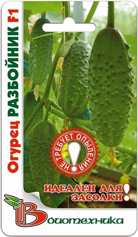 Гибрид Разбойник F1, раннеспелый, партенокарпический.Завязь букетная, в пазухе 3-4 завязи. Зеленец длиной 5-6 см, цилиндрической формы, крупнобугорчатый, темно-зеленый. Консистенция мякоти плотная, хрустящая.Для регионов с прохладным климатом необходим рассадный способ выращивания. Семена высевают в горшочки диаметром 10 см со специально подготовленной почвой (2 части перегноя, 1 часть дерновой земли, 1 часть песка) на глубину 1,5 см. Температура воздуха и почвы должна быть 20-23°С. Грунт равномерно увлажняют (не допускается перелив и закисание почвы). После появления всходов, в процессе роста растений, не допускать снижение температуры ниже 14°С. Сделать 1-2 подкормки полным минеральным удобрением с преобладанием азота. Рассада высаживается, когда минует угроза заморозков.