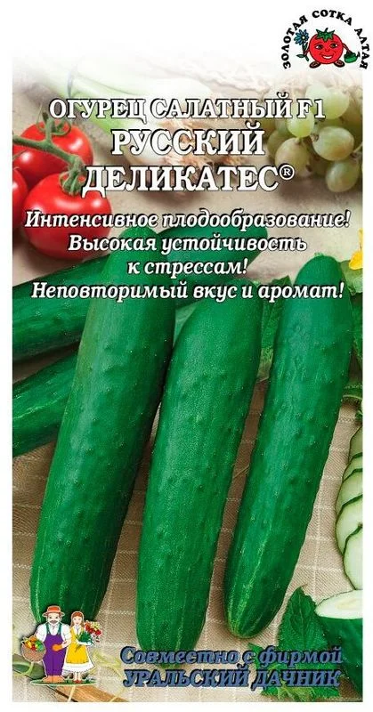 Раннеспелый, салатный, партенокарпический гибрид, преимущественно женского типа цветения, для открытого и защищенного грунта. Зеленцы крупнобугорчатые, крепкие, удивительно вкусные, ароматные и хрустящие, без горечи. Ценность сорта: стабильная урожайность, дружное плодоношение, отличные вкусовые качества, устойчивость к мучнистой росе, высокая завязываемость плодов при недостаточной освещенности и пониженных температурах.Сорта и гибриды серии Русский деликатес® – это то, что не устает восхищать и радовать не только самих садоводов, но и членов их семей (в первую очередь, детей, которым сложно привить любовь к овощам на столе). Все овощи серии Русский деликатес® на порядок слаще и лакомее за счет того, что имеют богатый, насыщенный вкус, нежную сахаристую структуру и яркий, неповторимый аромат и совсем не похожи на те современные «пластмассовые» овощи, которые лежат на прилавках современных супермаркетов. Мы хотим, чтобы на ваших грядках росли лучшие овощи!Огурцы выращивают, высевая семенами в грунт или через рассаду. Для получения рассады семена высевают в конце марта – начале апреля, на глубину 1-2 см, при температуре 25 градусов. Рассаду высаживают в грунт, когда минует угроза заморозков. Семенами огурец высевают в конце мая. Глубина заделки 1-1,5 см. Посевы укрывают плёнкой. Схема посадки 60х15 см. Для отличных урожаев необходим полив тёплой водой, подкормки раз в 2 недели, прополки, рыхление. Нерегулярный сбор плодов снижает урожайность.