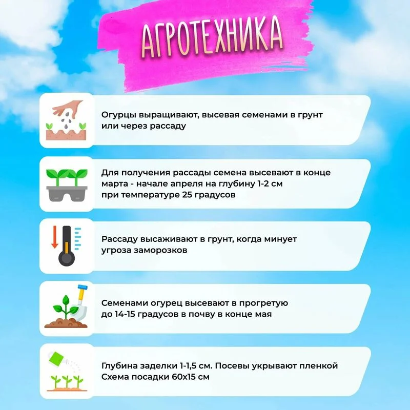 Агротехника. Огурцы выращивают, высевая семенами в грунт или через рассаду. Для получения рассады семена высевают в конце марта – начале апреля на глубину 1-2 см при
