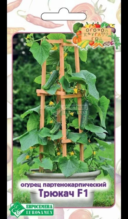 «Трюкач F1»- раннеспелый компактный гибрид женского типа цветения для комнатной культуры. Плоды темно-зеленые, крупно бугорчатые, малошипые, длиной 8-10 см, массой 50-60 г, в узлах до 5 завязей, генетически без горечи, вкус отличный. Агротехника: для огурца пригодны плодородные среднесуглинистые, воздухопроницаемые почвы. Хорошие предшественники - картофель, лук, капуста, перец. Семенами огурец высевают в прогретую до 14-15°С почву. Глубина заделки 2-3 см. Посевы укрывают пленкой. Рассадой огурцы высаживают в открытый грунт, когда минует угроза заморозков. Плотность посадки 3-4 растения на 1 кв.м. Для правильного развития растений нижние 4-5 завязей и 1-2 боковых побега следует прищипывать, последующие боковые побеги прищипываются над 2-ым листом. Уход за огурцами заключается в регулярном поливе теплой (22-25 градусов) водой, рыхлении, подкормках органическими и минеральными удобрениями.