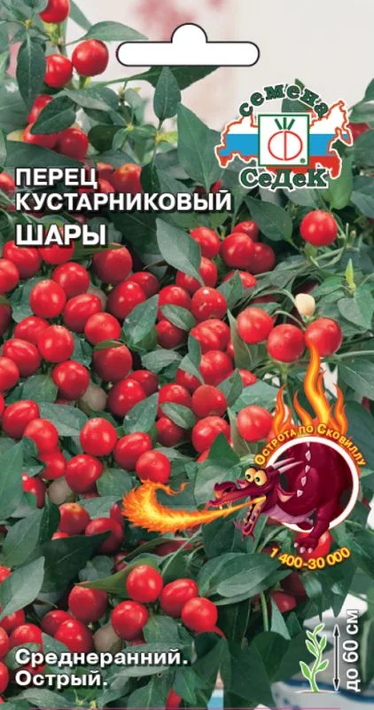 Среднеранний (100-115дней) необычайно красивый, обильно плодоносящий сорт для выращивания на клумбах, садовых бордюрах, в теплицах, цветниках, зимних садах, на балконах и подоконниках. Растение прямостоячее, облиственное, высотой до 60 см. Плоды многочисленные, округлые, направлены вверх, с букетным расположением, диаметром 3-3,5см, массой 15 г, темно-зеленые в технической спелости, ярко-красные, глянцевые - в биологической. Вкус острый, аромат перечный. Острота перца зависит от солнечной инсталляции и от места выращивания. В сушеном виде перцы так же становятся более острыми. Ценность сорта: устойчивость к вирусу табачной мозаики, стрессоустойчивость, длительное плодоношение и высокая урожайность, декоративность. Идеально подходит для сушки, приготовления острых соусов, приправ, аджики, маринадов, солений.