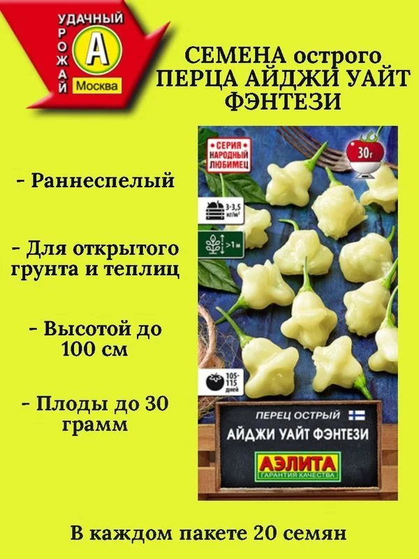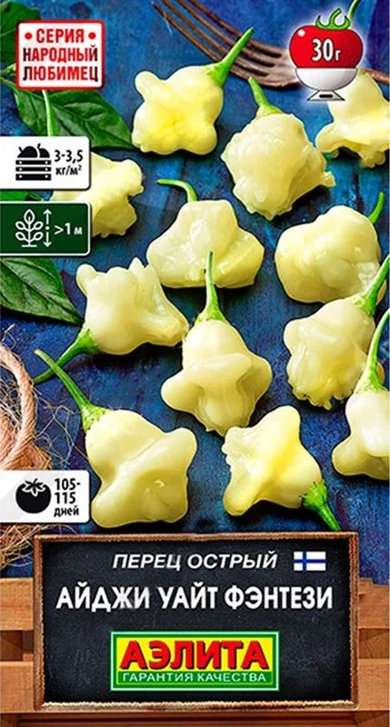 Знаменитый современный сорт из Финляндии, уже полюбившийся ценителям острого перца по всему миру.Известен гурманам как "Aji Fantasy Sparkly White", степень остроты 4 балла из 10 по шкале Сковилла. По сравнению со своим прародителем – желтым перцем-чили "Aji Fantasy", отличается фантастической продуктивностью (до 100 перчиков c куста!), более толстой (3-4 мм) и сочной мякотью, сбалансированной "мягкой" остротой (семена очень острые), сладковатым вкусом и фруктовым ароматом. Куст раскидистый, крепкий, высотой в теплице более 1 м.Плоды массой 25-30 г созревают рано, через 105-115 дней от всходов. Очень полезны для здоровья, их следует употреблять в свежем виде, мариновать и сушить впрок.