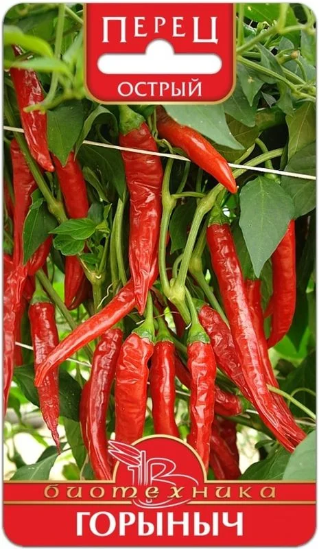 Перец острый Горыныч – очень красивый сорт острого перца. Отличается от ранее полученных сортов раннеспелостью, высокой пластичностью к условиям выращивания (может хорошо расти как в открытом, так и защищённом грунте, а также в комнатных условиях), великолепным внешним видом длинных закрученных плодов с высоким содержанием витамина С, каротина и капсаицина. Растение штамбовое, сомкнутое, высотой 35-45 см. Количество плодов перца острого Горыныч на кусте до 40 штук. Плод длинный – 18-20см., конусовидной формы, слегка скрученный вокруг своей оси. В технической спелости цвет плода зелёный, в биологической ярко-красный. Содержание витамина С 240 мг %. Плоды используют в свежем, консервированном и сушеном виде. Так же перец острый Горыныч культивируется в качестве декоративного растения.