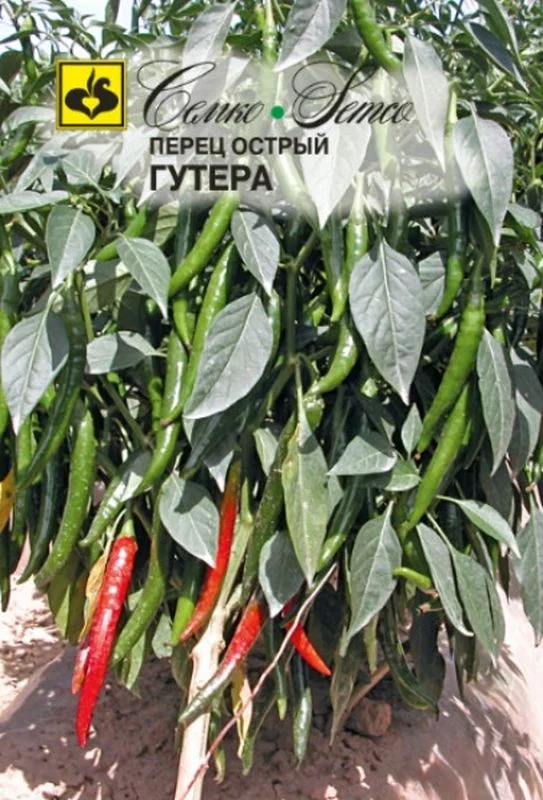 Перец Гутера - среднеранний сорт острого перца типа чили. От всходов до технической спелости 105-110 дней, до биологической 120-130 дней. Растение среднерослое высотой до 50-60 см, с множеством боковых побегов, специальной формировки не требуется. На растении одновременно формируется 15-20 плодов. Перцы узкоконусовидные, длиной до 12 см, диаметр у основания плодоножки 1-1,5 см, пониклые, глянцевые, массой 10-15 г, толщина стенки 1-1,3 мм. В технической спелости плоды тёмно-зелёные, в биологической – тёмно-красные. Перец Гутера дружносозревающий, жаростойкий. Вкус острый. Товарность и транспортабельность высокие. Рекомендуется для выращивания в открытом грунте, во всех типах теплиц, на балконах и в комнатных условиях. Используется для потребления в свежем виде, при консервировании и засолке овощей, для сушки. Густота посадки 6-8 раст./м2, схема посадки 70х25 см. Урожайность 1,2-3,0 кг/м2.