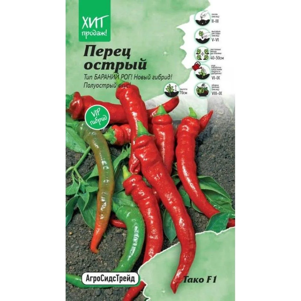 Позднеспелый гибрид, время с момента массовых всходов до первого сбора составляет 127 дней. Предназначен для выращивания в защищенном грунте. Растение чашеобразное. Листовая пластинка среднего размера, ланцетовидной формы, темно-зеленого цвета, морщинистость очень слабая. Плодоножка полупониклая. Плод хоботовидный, слабо морщинистый (тип бараний рог), в технической спелости окраска зеленая, в биологической спелости - темно-красная, глянцевость средняя, без ребристости. Средняя масса плода - 29 гр., толщина стенки - 2-3 мм, количество камер - 2-3. Вкус среднеострый. Острый перец Тако используется в кулинарии для приготовления острых соусов, таких как соус Табаско, а также для добавления остроты в различные блюда. Он также может использоваться в качестве приправы для мяса, рыбы и овощей. Агротехника: Перец острый – теплолюбивая культура, требующая плодородных хорошо дренируемых почв. На рассаду семена высевают в середине февраля – начале марта. Оптимальная температура прорастания 20-25°С. Всходы появляются через 12-15 дней, пикируют сеянцы в фазе 1-2 листа. За 7-14 дней перед высадкой рассады на постоянное место рекомендуется проводить закаливание растений. Схема посадки 30×40 см. Растение формируют в 1 стебель. Уход заключается в поливе, рыхлении и своевременных подкормках.