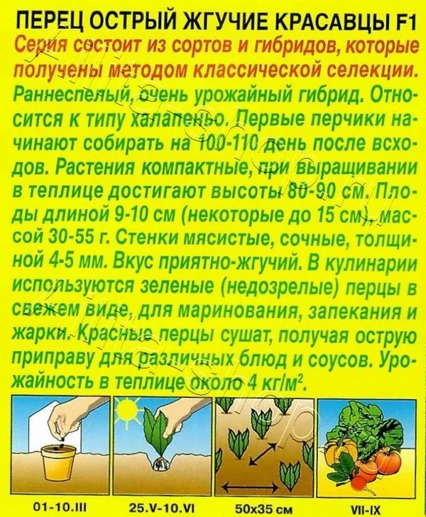 Серия состоит из сортов и гибридов, которые получены методом классической селекции. Раннеспелый, очень урожайный гибрид. Относится к типу халапеньо. Первые перчики начинают собирать на 100-110 день после всходов. Растения компактные, при выращивании в теплице достигают высоты 80-90 см. Плоды длиной 9-10 см (некоторые до 15 см), массой 30-55 г. Стенки мясистые, сочные, толщиной 4-5 мм. Вкус приятно-жгучий. В кулинарии используются зеленые (недозрелые) перцы в свежем виде, для маринования, запекания и жарки. Красные перцы сушат, получая острую приправу для различных блюд и соусов. Урожайность в теп лице около 4 кг/м 2. Необходима пространственная изоляция от перца сладких сортов. Для смягчения остроты рекомендуем удаление плаценты с семенами.