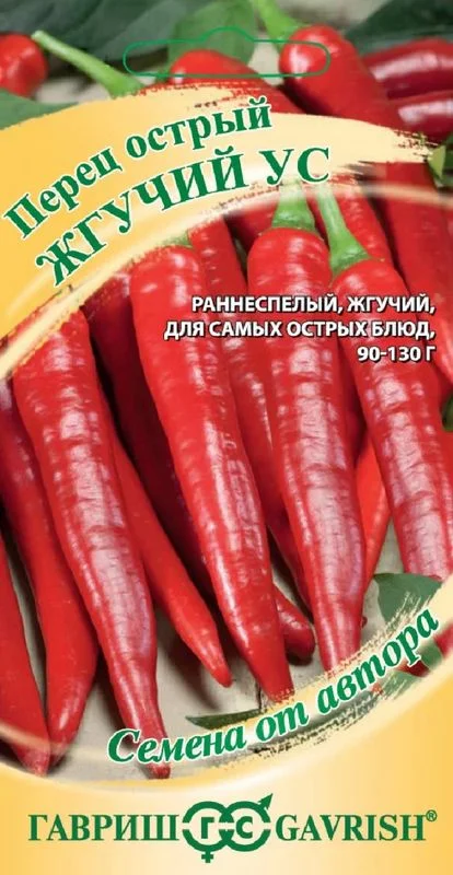 Жгучий перец имеет множество названий,кто-то зовет его «чили», кому-то по душе «острый». Известно очень много сортов острого перца и все они имеют свои особенности. Но главной отличительной чертой считается жгучесть или острота плодов. Жгучий ус является одним из самых острых сортов среди острого перца. Очень урожайный раннеспелый (от всходов до технической спелости 100-105 дней) сорт для открытого грунта и теплиц. Растение среднеоблиственное, раскидистое, с междоузлиями средней длины. Плод удлиненно-конусовидный, среднеребристый, с поперечной волнистостью, 2-камерный, длиной 18-20 см, массой 90-130 г, с эластичной слабоострой стенкой толщиной 3-4 мм и приятным вкусом. Окраска незрелого плода зеленая, зрелого -  красная, глянцевая. Используют как специю, добавляют в салаты, первые и вторые блюда, для оформления, является основой многих приправ и соусов. Выращивают рассадным способом. Посев на рассаду — в конце февраля. Глубина заделки семян до 1 см.  Пикировка в фазе семядолей. Высадка рассады - в конце мая.Формировка: удаление всех боковых побегов и листьев до первой развилки. Нельзя высаживать рассаду сладких и острых сортов перца рядом, т.к. происходит переопыление и сладкий перец приобретает горький вкус.