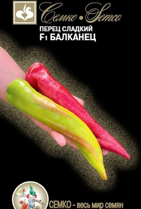 Перец сладкий Балканец F1 - ранний гибрид для выращивания в открытом грунте и теплицах, сортотип Капия. От всходов до технической спелости 95-100 дней, до биологической 105-110 дней. Растение высотой до 1 метра, формировка не требуется. Плоды удлиненно-вытянутые, длиной 15-20 см, диаметром 4-5 см, массой 85-100 граммов, толщина стенки 5-6 мм. В технической спелости плоды светло-зелёной окраски, в биологической – насыщенно-красного цвета. Жаростойкий, дружносозревающий, засухоустойчивый. Вкус плодов отличный, транспортабельность хорошая. Устойчив к вирусу табачной мозаики (TMV 1-2), толерантен к вертициллезу (Va,Vd). Рекомендуется для выращивания в теплицах, на юге - в открытом грунте. Схема посадки 70х25 см. Урожайность свыше 8 кг/м2.