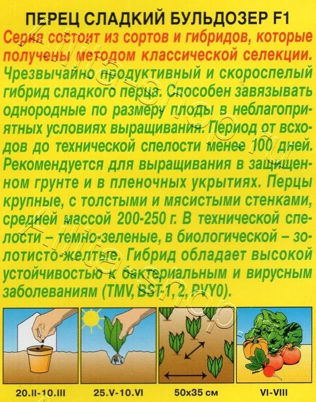 Чрезвычайно продуктивный и скороспелый гибрид сладкого перца. Способен завязывать однородные по размеру плоды в неблагоприятных условиях выращивания. Период от всходов до технической спелости менее 100 дней. Рекомендуется для выращивания в защищенном грунте и в пленочных укрытиях. Перцы крупные, с толстыми и мясистыми стенками, средней массой 200-250 г. В технической спелости – темно-зеленые, в биологической – золотисто-желтые. Гибрид обладает высокой устойчивостью к бактериальным и вирусным заболеваниям.