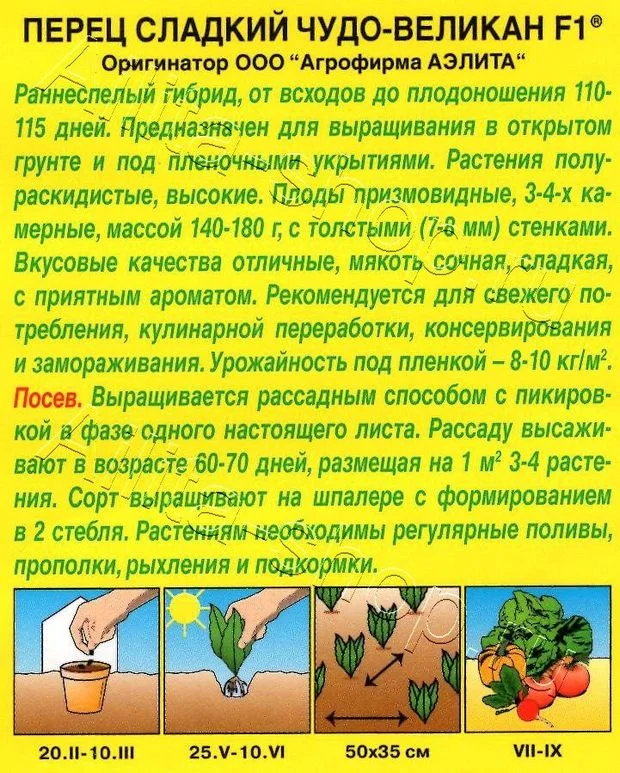 Ранний гибрид для теплиц в средней полосе и открытого грунта в южных регионах. От всходов до начала плодоношения около 110 дней. Отличается хорошей адаптацией к условиям выращивания и высокой завязываемостью плодов. Высота растений в о/г 70-80 см, в теплицах – до 150 см. Плоды толстостенные (7-8 мм), массой 140-180 г. Вкус великолепный. Урожайность под пленкой 8-10 кг/м 2.Посев на рассаду в начале марта, пикировка в фазе одного настоящего листа, высадка на постоянное место 70-дневной рассады по схеме 50х35 см. Высокорослые сорта выращивают на шпалере с формировкой в 2 стебля, низкорослые – в обычной штамбовой форме, без подвязки.
