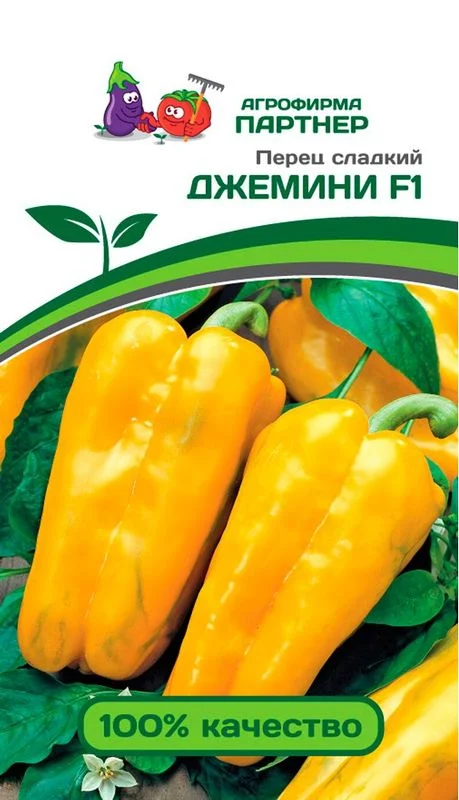 Раннеспелый, чрезвычайно продуктивный гибрид, тип «ламуйо». От всходов до технической спелости 85-90 дней.Растение среднерослое, компактное, высотой до 60 см, одновременно формирует до 10 плодов-«близнецов» внушительных размеров. Плоды красивой удлиненно-кубовидной формы, до 18 см длиной, гладкие и блестящие, массой 200-250 г, в технической спелости темно-зеленые, в биологической - ярко-желтые. Толщина мясистой стенки 5,5 -7 мм. Вкусовые качества отличные, товарность высокая. Отмечается хорошая облиственность, которая защищает плоды от солнечных ожогов. Устойчив к стрессовым и неблагоприятным погодным условиям, поэтому подходит для выращивания в регионах с прохладным и коротким летом. При температуре +25+28°C семена прорастают на 10-й день. Высевать только пророщенные семена. У Джемини F1 высокий иммунитет к основным заболеваниям перца на всех этапах роста, в том числе и к вирусу картофеля. Подходит для консервирования, домашней кулинарии и свежего потребления. Рекомендуется для выращивания в открытом грунте и плёночных теплицах. Плотность посадки 3-4 растения/м2. Урожайность в открытом грунте 4,0-5,0 кг/м2, в защищённом – 7,0-9,0 кг/м2.