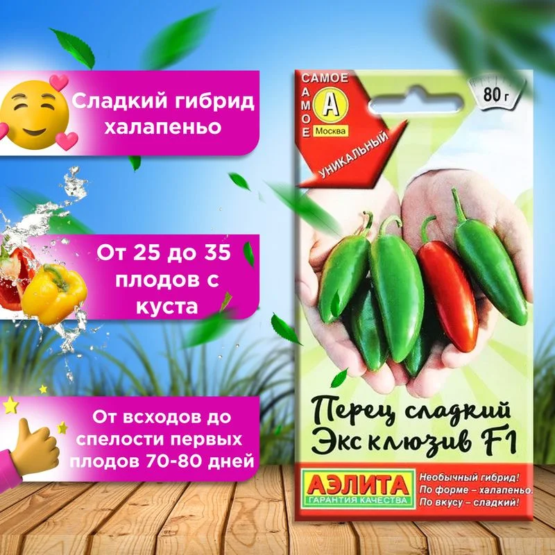 Очень необычная новинка. Этот гибрид перца халапеньо обладает уникальным качеством - он сладкий! Плоды его в среднем имеют длину от 5 до 9 с ми массу 80 г, со стенками средней толщины. Они очень сочные, с приятной кислинкой. От всходов до технической спелости первых плодов 70-80 дней. Высота растений 0,8-1 м. Гибрид плодоносит непрерывно на протяжении всего сезона и дает большой урожай. С каждого куста можно снять от 25 до 35 плодов, по мере их роста и созревания. В основном перцы используют зелеными. Популярен халапеньо фаршированный, запеченный на гриле, маринованный и свежий. В биологической спелости плоды краснеют. Красные перцы используют для сушки. Перец прекрасно растет в средней полосе России. Лучше растет в теплицах или в хорошо защищенном от непогоды месте. В южных регионах рекомендуется выращивать в открытом грунте. Куст не требует формирования.