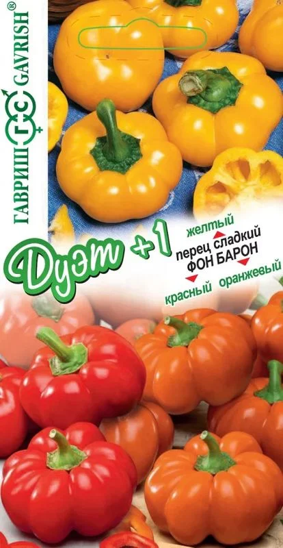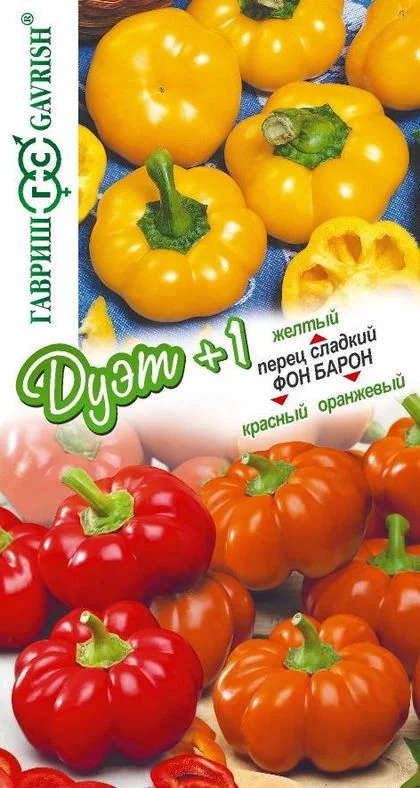Перец сладкий ФОН БАРОН ОРАНЖЕВЫЙ Среднеспелый начинает обильно плодоносить через 110-115 дней. Рекомендуется для открытого грунта и пленочных теплиц. Растение высотой до 100 см Зрелые плоды желтого цвета, сладкие, массой 140-180 г, имеют форму маленькой тыквы. Используются для различных нарезок, порционной подачи салатов, мяса фарширования, запекания и консервирования. Сорт переносит кратковременные понижения температуры.