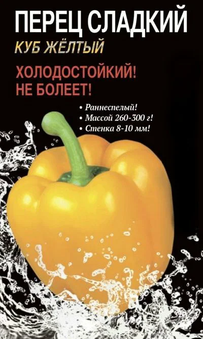 Раннеспелый,суперурожайный сорт для открытого грунта и пленочных укрытий. Плоды кубовидные, глянцевые, золотисто-желтые, массой 260-300 г. Толщина стенки 8-10 мм. Мякоть ароматная, сочная, сладкая.Ценность сорта:стабильная урожайность, холодостойкость, отличные вкусовые качества, устойчивость к болезням.Посев на рассаду в конце февраля – начале марта, пикировка в фазе одного настоящего листа. Рассаду рекомендуется выращивать в течение 60 дней от всходов и высаживать в фазе бутонизации. В теплицу высаживают в середине мая, а в открытый грунт-в середине июня, после окончания весенних заморозков, по схеме 40х60 см. Высокорослые сорта выращивают на шпалере, с формировкой в 2 стебля, низкорослые-в обычной штамбовой форме, без подвязки. Культура теплолюбива, требовательна к плодородию и влажности почвы.
