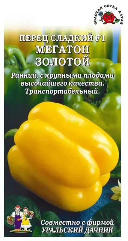 Гибрид раннего срока созревания. Для выращивания в теплицах, парниках, туннелях. Растение высокорослое (80-85 см), мощное. Плоды гибрида Мегатон F1 сразу выделяются на общем фоне, плоды его величественно висят по периметру куста крупными ровными тяжёлыми кубами, гладкие, глянцевые.Плоды одни из самых крупных среди цветных перцев, вес их колеблется от 260 до 300 г(!), толщина стенки от 0,8 до 1 см (!), мякоть брызжуще-сочная, необыкновенно вкусная и ароматная. В собранном Вами урожае плоды перца будут «равны, как на подбор» — один к одному крупные, толстостенные, вкусные и полезные. Выращивание этого гибрида доставит Вам большое эстетическое удовольствие. У плодов плотная кожица, они отличаются отличной транспортабельностью, Вы сможете перевозить их на любые расстояния, так как плотная кожица препятствует повреждению плодов, поэтому они ещё и долго хранятся. Несомненным достоинством гибрида является высокая пластичность: он способен приспосабливаться к крутому нраву российской погоды. Благодаря плотной кожице, плоды переносят легкие заморозки осенью, в то время как плоды других сортов с нежной кожицей повреждаются. Комплексная устойчивость к болезням, присущая гибриду, повышает гарантированность получения урожая. Рекомендуется для использования в свежем виде и консервирования.Посев на рассаду в конце февраля – начале марта, пикировка в фазе одного настоящего листа. Рассаду рекомендуется выращивать в течение 60 дней от всходов и высаживать в фазе бутонизации. До определенного момента перец растет в один стебель, но при достижении высоты 15-20 см начинает разветвляться, образуя несколько ветвей. На месте разветвления формируется первый цветочный бутон, который овощеводы называют коронным. Его для лучшего ветвления и развития куста следует удалить. В теплицу высаживают в середине мая, а в открытый грунт – в середине июня, после окончания весенних заморозков, по схеме 60х60 см. Высокорослые сорта выращивают на шпалере, с формировкой в 2 стебля. Культура теплолюбива, требовательна к плодородию и влажности почвы.
