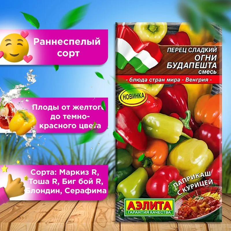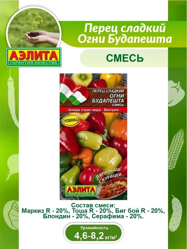 Смесь популярных урожайных перцев для приготовления самых вкусных блюд! В нее входят сорта: Маркиз (раннеспелый, плоды до 150 гр.)- 20%, Тоша (раннеспелый, плоды до 70 гр.)- 20%, Биг бой (раннеспелый, плоды до 300 гр.)- 20%, Блондин (среднеспелый, плоды до 300 гр.)- 20%, Серафима (раннеспелый, плоды до 180 гр.)- 20%.  Растения полуштамбовые и раскидистые, высотой от 50 до 110 см. Плоды от желтого до темно-красного цвета, с толстыми стенками – 6…9мм. Все перчики обладают отличным вкусом – сладкие, ароматные и сочные. Идеально подойдут для свежих салатов, фарширования и консервирования. Урожайность 4,6-8,2 кг/м2.
