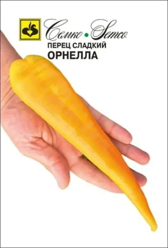 Перец Орнелла - среднеспелый сорт для открытого грунта с желтой окраской плодов. От всходов до технической спелости 95–100 дней, до биологической 115–120 дней. Растение компактное, высотой 50–60 см, специальной формировки не требует. На одном растении завязывается 7–9 плодов. Плоды треугольной формы, длиной 20–24 см, шириной 5–6 см, с заостренной вершиной, массой 130–140 г, толщина стенки 4–5 мм, пониклые, гладкие, глянцевые. Место прикрепления плодоножки выпуклое. Плоды в технической стадии светло-зеленые, в биологической – насыщенно желтой окраски. Дружносозревающий. Плоды сладкие с характерным перечным ароматом, сочные. Товарность и транспортабельность хорошие. Перец Орнелла устойчив к вирусу табачной мозаики (TMV). Используется для потребления в свежем виде, домашней кулинарии и консервирования. Схема посадки 70х25см. Урожайность 4–5 кг/м2.
