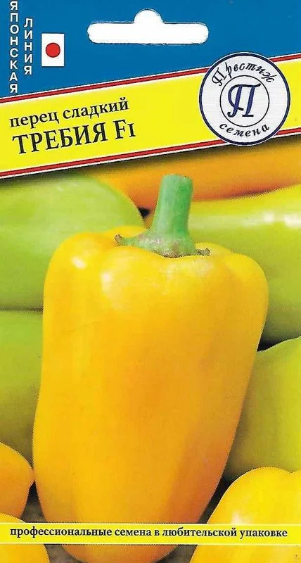 Перец сладкий Требия F1 — среднеспелый гибридный сорт со сроком вызревания 4 месяца. Подходит для выращивания в открытом грунте и теплицах. Показывает толерантность к фузариозу, вирусу мозаики и вершинной гнили. Плоды в стадии вызревания имеют зеленый цвет, к моменту спелости — желто-оранжевый. Форма плодов — призмовидная, структура 4-камерная. Средний вес — 350 граммов при длине 12−15 см. Толщина стенок — 8−10 мм. При хорошей агротехнике можно получить экземпляры весом до 500 граммов длиной 25 см.   Источник: https://abekker.ru/product/perec-sladkiy-trebiya-f1