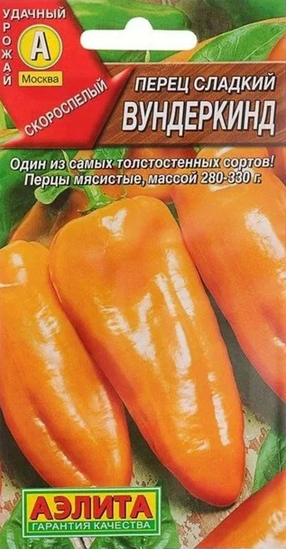 Сорт ВУНДЕРКИНД формирует длинные, массивные плоды с рекордно толстой стенкой – 9-10 мм! Сорт скороспелый, вступает в плодоношение на 105 день от массовых всходов. Растения 60-70 см высотой. Перцы конусовидные, длиной 18-20 см, в технической спелости – беловатые, в биологической – оранжевые. Средняя масса товарного плода 280-330 г. Сочная, сладкая, толстая мякоть необыкновенно вкусна в свежих салатах и в разнообразных зимних заготовках. Урожайность высокая, 6-7 кг/м2 . Для теплиц и открытого грунта. Посев. Выращивают рассадным способом. Рассаду высаживают в возрасте 60-70 дней, размещая на 1 м23-4 растения. В теплице сорт выращивают на шпалере с формированием в 2 стебля. Растениям необходимы регулярные поливы, прополки, рыхления и подкормки. 20.II-10.III 25.V-10.VI  50х35 cm VII–IX