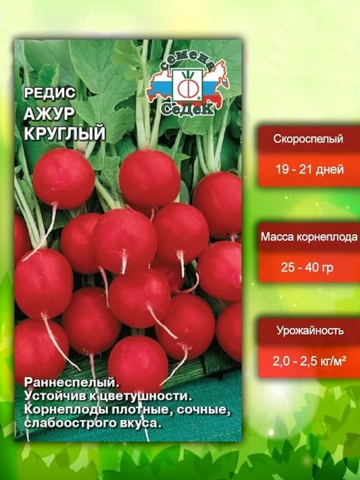 Раннеспелый (20-25 дней) сорт для выращивания в открытом и защищенном грунте. Розетка листьев среднего размера. Корнеплоды округлые, гладкие, ярко-красные, массой 25-35 г. Мякоть белая, плотная, сочная, слабоострая. Урожайность 2,5 кг/м2.Ценность сорта: устойчивость к цветушности, корнеплоды не растрескиваются, не одревесневают.Сорт отличается высоким  выходом товарной продукции.Рекомендуется для употребления в свежем виде, приготовления весенних салатов и окрошки.