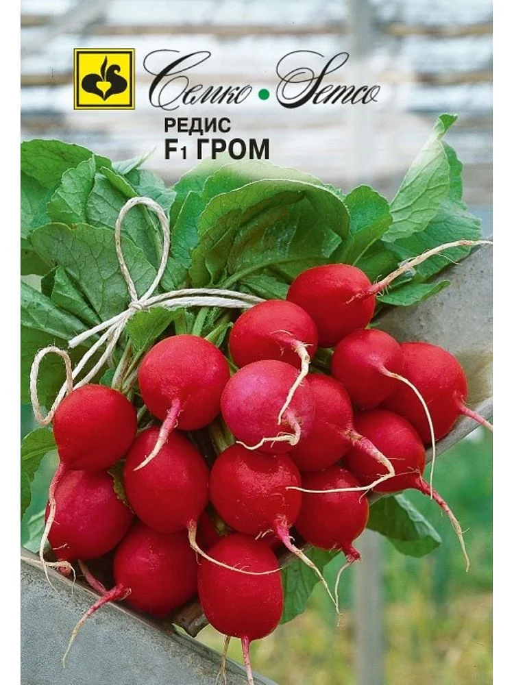 Редис Гром F1 - ранний гибрид редиса для выращивания в парниках, теплицах и открытом грунте. От всходов до технической спелости 25-27 дней. Розетка листьев компактная, полупрямостоячая, листья серовато-зелёные, обратнояйцевидные. Корнеплод округлый, диаметром 3-4 см, массой до 40 г, ярко-красного цвета, стержневой корень тонкий, головка выпуклая. Мякоть корнеплода белая, стекловидная, сочная, слабоострого вкуса, долго не дряблеет и не грубеет. Вкусовые качества отличные. Товарность высокая. Редис Гром F1 устойчив к цветушности, одревеснению и растрескиванию корнеплода. Рекомендуется для выращивания во всех типах теплиц, а также в открытом грунте с весны до осени. Схема посева 10-15х3 см.Урожайность 3,5-4,5 кг/м2.