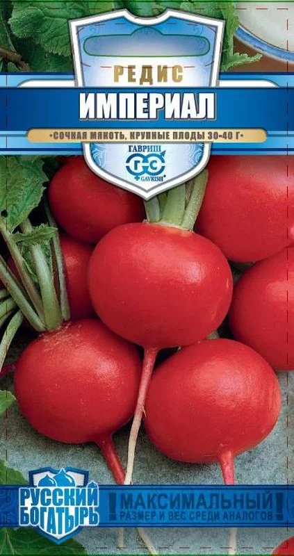 Редис-один из первых весенних плодов, которые появляются в нашем меню после долгой зимы. Это сочный, приятный на вид плод со сладковатой остротой, богат клетчаткой и витаминами. Сорт среднеспелый, через 25-30 дней можно собирать первый урожай очень крупных корнеплодов. Красные плоды имеют округлую форму диаметром 8-10 см и массой 30-40 г, с белой, хрустящей мякотью. Вкусовые качества отменные. Используют в свежем виде: нарезке, салатах, окрошке. Из редиски готовят закуски, бутерброды.Сорт относительно устойчив к болезням.Посев в грунт проводится в конце апреля-начале мая, июле на глубину 1 см по схеме 5-7x15 см. Урожайность 3,2-3,4 кг/м2.