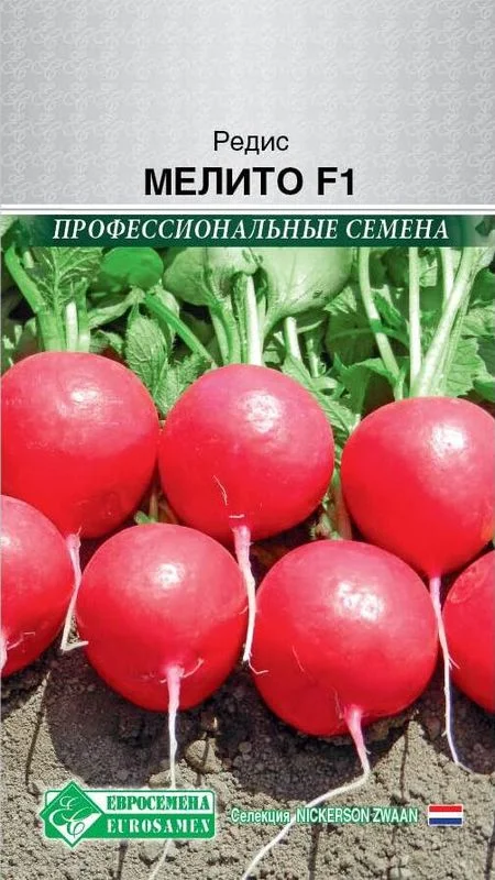 Редис Мелито F1–очень ранний гибрид-красавец от голландской компании Hazera (Nickerson Zwaan BV), крепкий и здоровый. Удачно сочетает раннеспелость с высоким выходом товарной продукции. Отличается от известных сортов отличным качеством продукции, транспортабельностью и устойчивостью к болезням, рекомендуется для раннего производства в пучках и предпочитает укороченный день, но неплохо переносит и жару.Корнеплоды нарядные, ярко-красные, выровненные, будто откалиброванные (4 см в диаметре), с белоснежной сочной хрустящей мякотью, без пустот, очень приятного гармоничного вкуса весенней свежести.Хорошо адаптируется к любой погоде. Отличная устойчивость к стрелкованию и растрескиванию, к ложной мучнистой росе (IR).