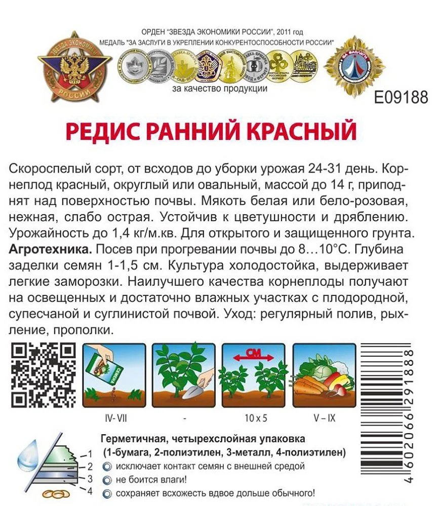 Скороспелый сорт, от всходов до уборки урожая 24-31 день. Корнеплод красный, округлый или овальный, массой до 14 г, приподнят над поверхностью почвы. Мякоть белая или бело-розовая, нежная, слабо острая. Устойчив к цветушности и дряблению. Урожайность до 1,4 кг/м.кв. Для открытого и защищенного грунта.