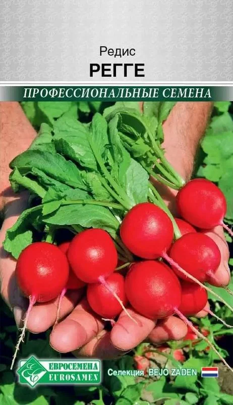 Регге-среднеспелый сорт редиса для выращивания в открытом грунте.Период от полных всходов до технической спелости корнеплодов 32 -35 дней. Корнеплод округлый, насыщенно-красного цвета, период выращивания – весна, лета, осень.Масса товарного корнеплода 26 г.Мякоть белая, плотная, очень сочная, приятного слабо острого вкуса.
