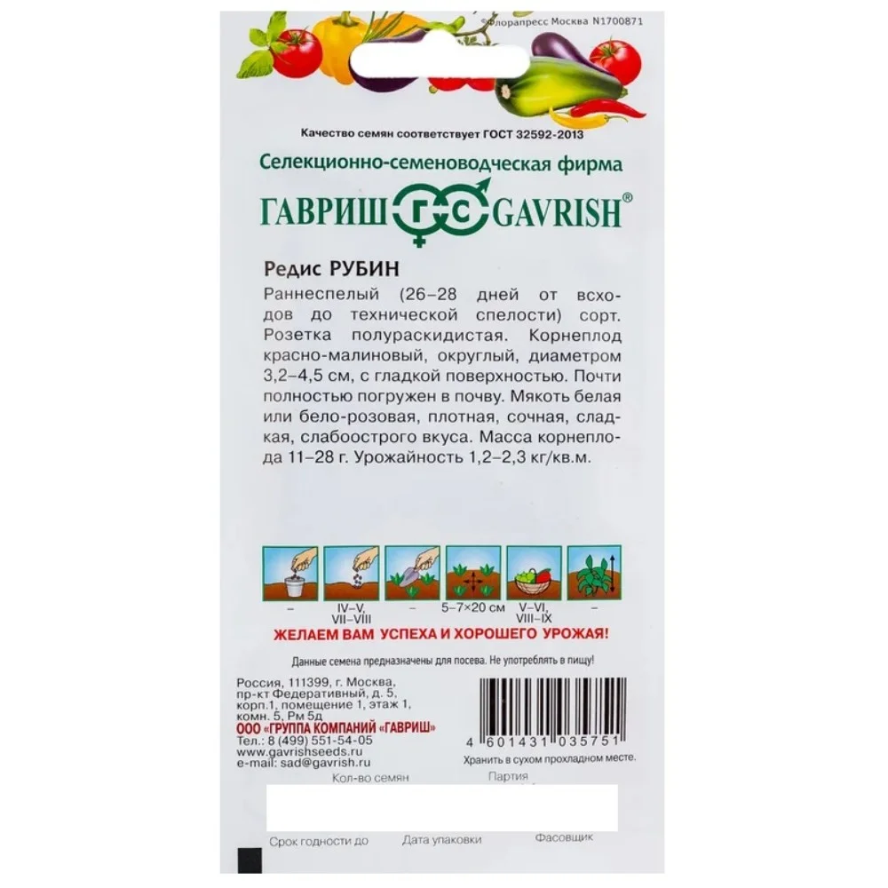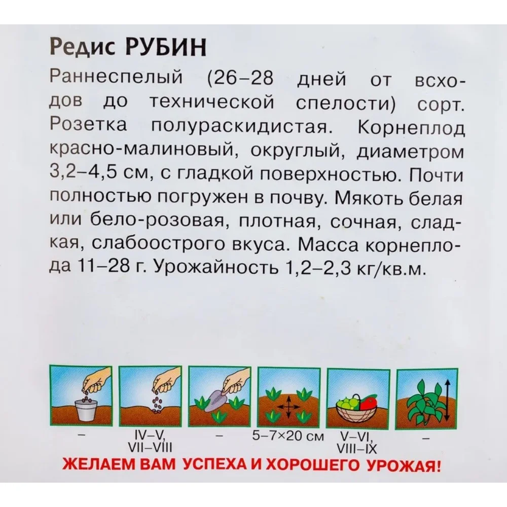 Раннеспелый (26-28 дней от всходов до технической спелости) сорт. Розетка полураскидистая. Корнеплод красно-малиновый, округлый, диаметром 3,2-4,5 см, с гладкой поверхностью. Почти полностью погружен в почву. Мякоть белая или бело-розовая, плотная, сочная, сладкая, слабо-острого вкуса. Масса корнеплода 10-30 г. Выращивают прямым посевом в открытый грунт на глубину 1-2 см. Урожайность 1,2-2,3 кг/м2. Ценность сорта: дружная отдача урожая, отличные вкусовые качества. Рекомендуется для выращивания в открытом и защищенном грунте.