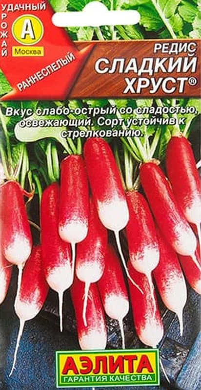 Раннеспелый сорт для открытого и защищенного грунта. Формирует урожай за 18-20 дней от всходов. Корнеплоды прекрасного товарного вида, однородные, яркие, плотные. Масса корнеплода 17-25 г, средняя длина 6 см, Ø 2-2,5 см. Мякоть белая, хрустящая, сочная, без пустот. Вкус приятный, слабо-острый со сладостью, освежающий. Урожайность 1,5-1,8 кг/м2. Сорт устойчив к стрелкованию.Посев в открытый грунт проводят на глубину 2 см. После появления первого настоящего листа всходы прореживают. Чтобы получать урожай в течение продолжительного  времени,  семена  высевают  несколько  раз за сезон с интервалом 15-20 дней. Растениям необходимы своевременные поливы, прополки, рыхления.