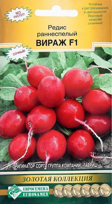 Вираж F1- скороспелый урожайный сорт редиса для ранне - весеннего и осеннего посевов в открытом грунте, а также для посадок в теплицах и для пленочных укрытий.
